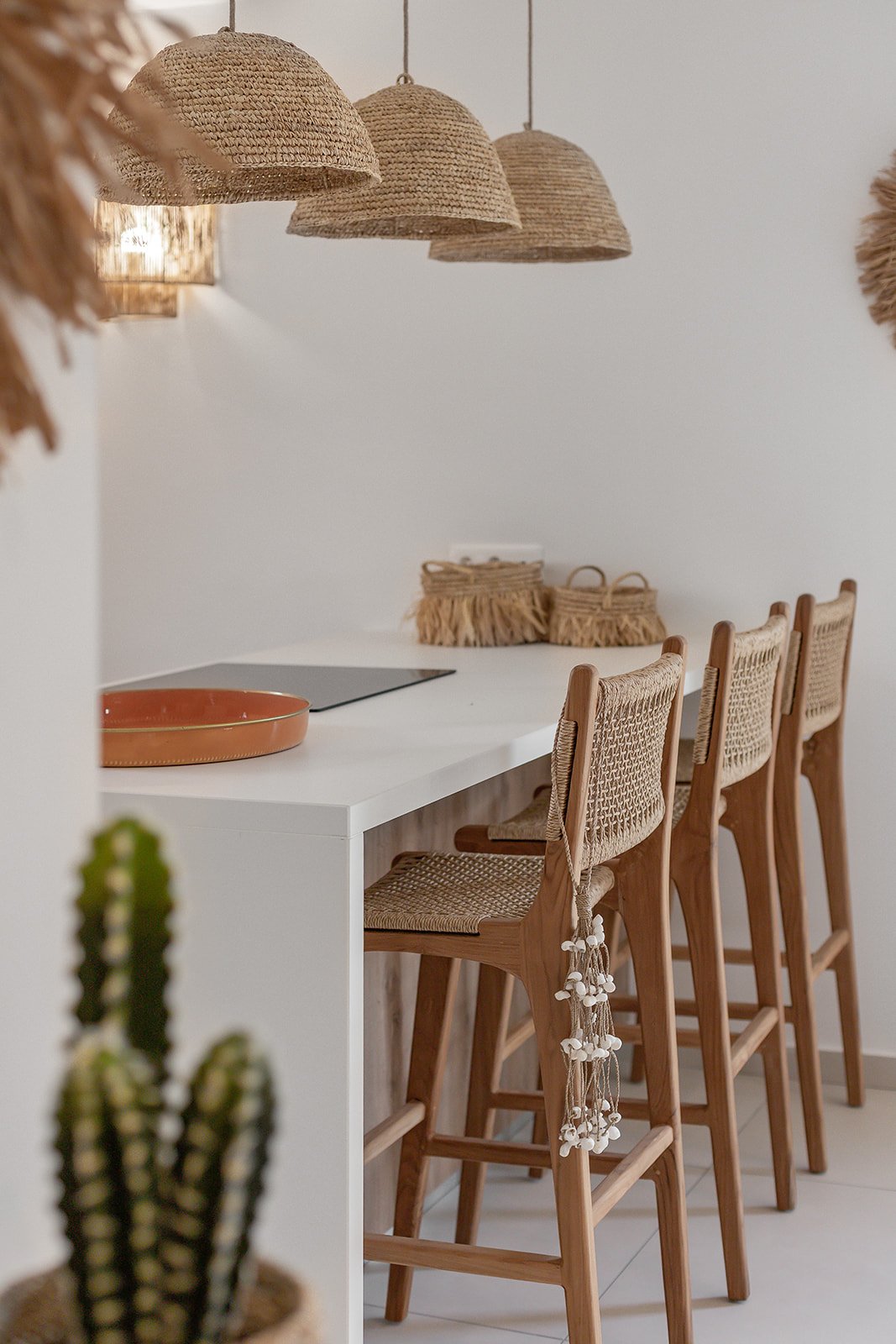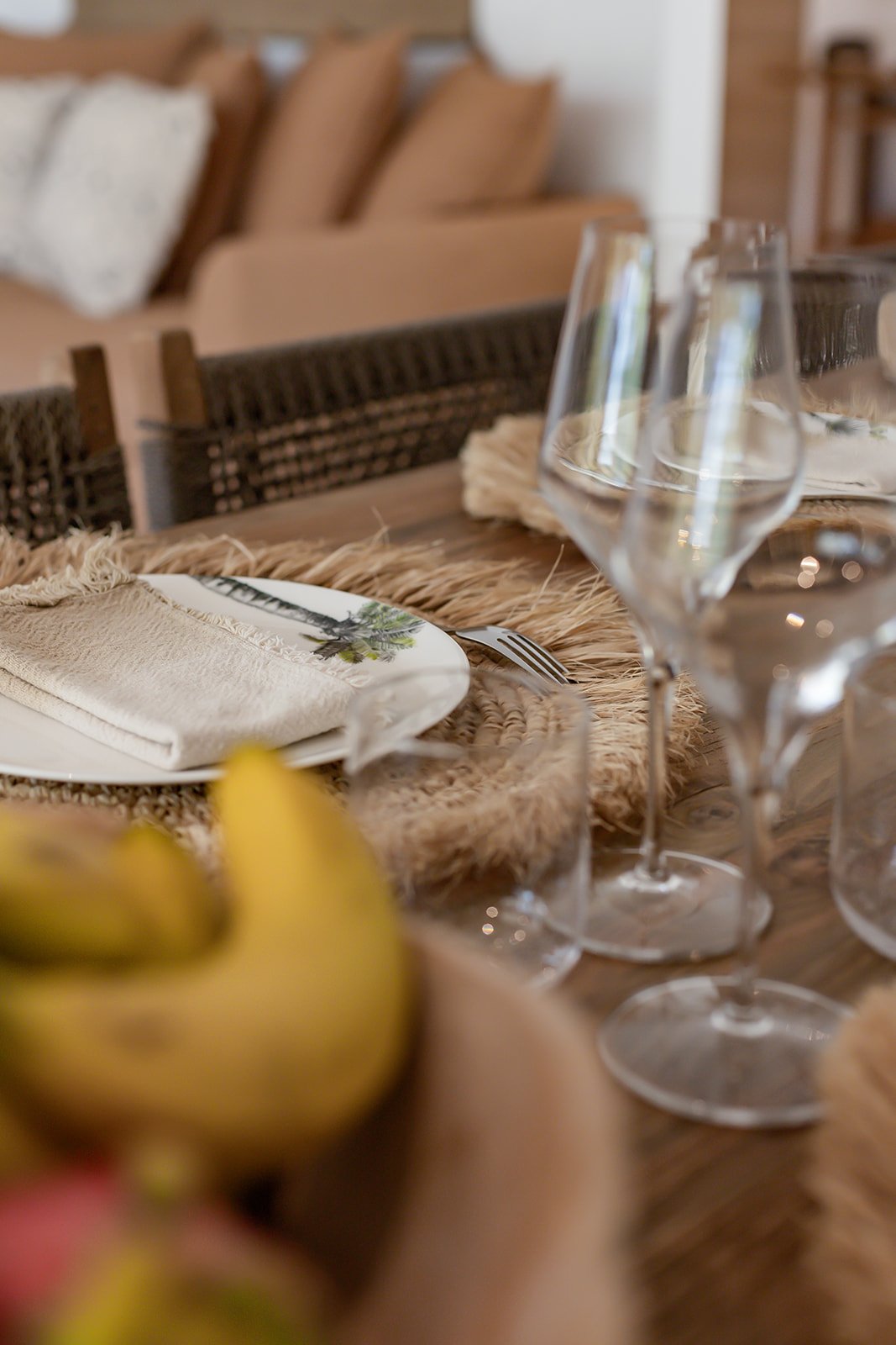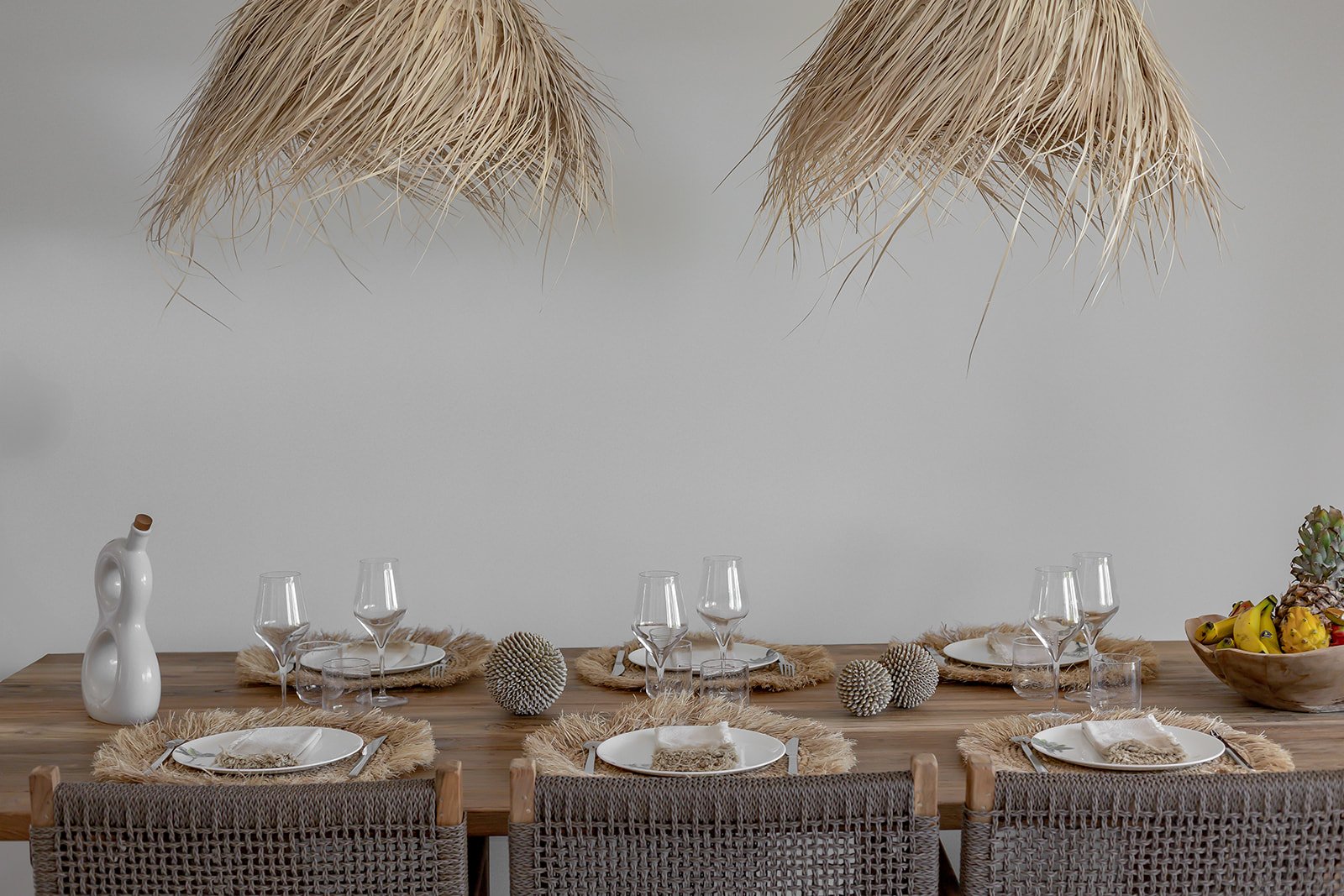 La Villa Coco propose une grande table, pouvant accueillir confortablement jusqu’à huit convives, idéale pour partager un déjeuner au frais, tout en profitant du calme d’un écrin de verdure. Ouverte sur l’extérieur et harmonieusement intégrée à l’espace de vie, elle devient le théâtre des repas en famille ou entre amis, dans une atmosphère détendue et lumineuse, bercée par les embruns et la douceur du climat.