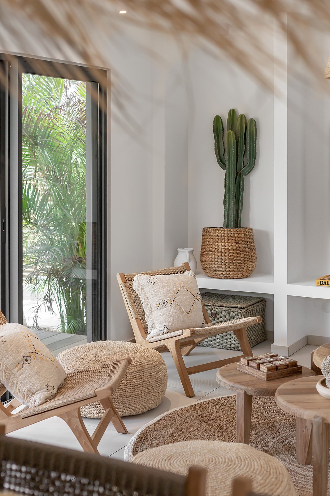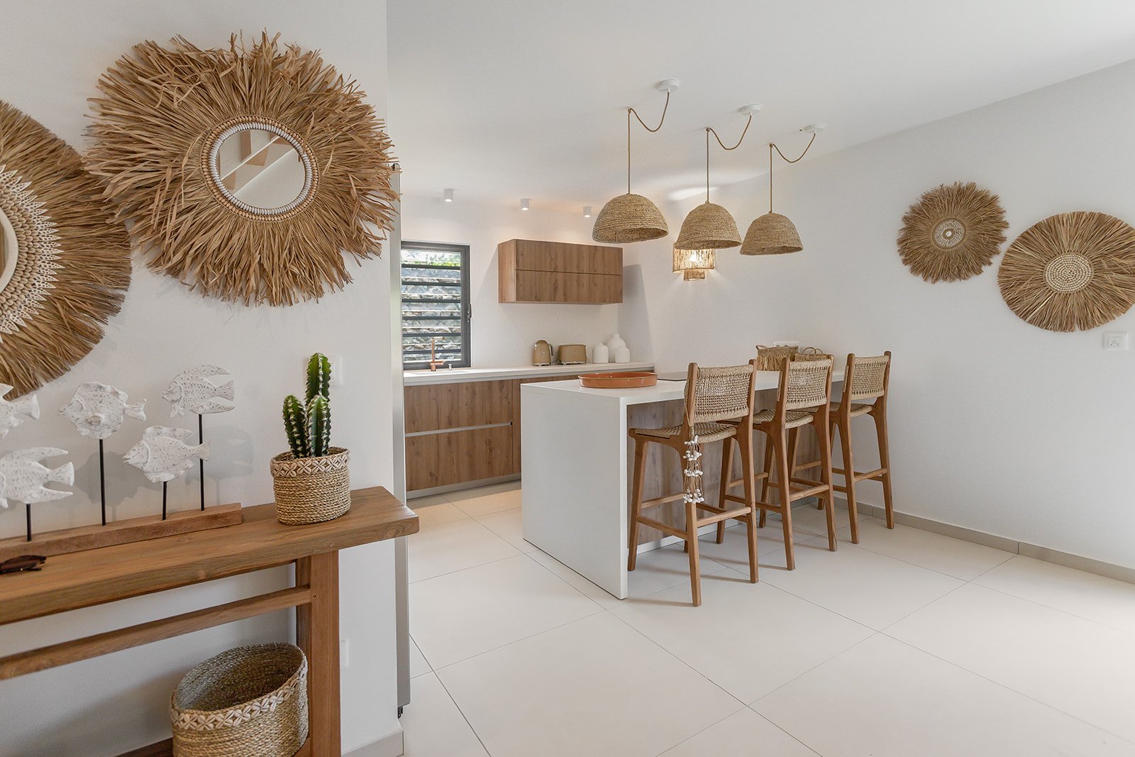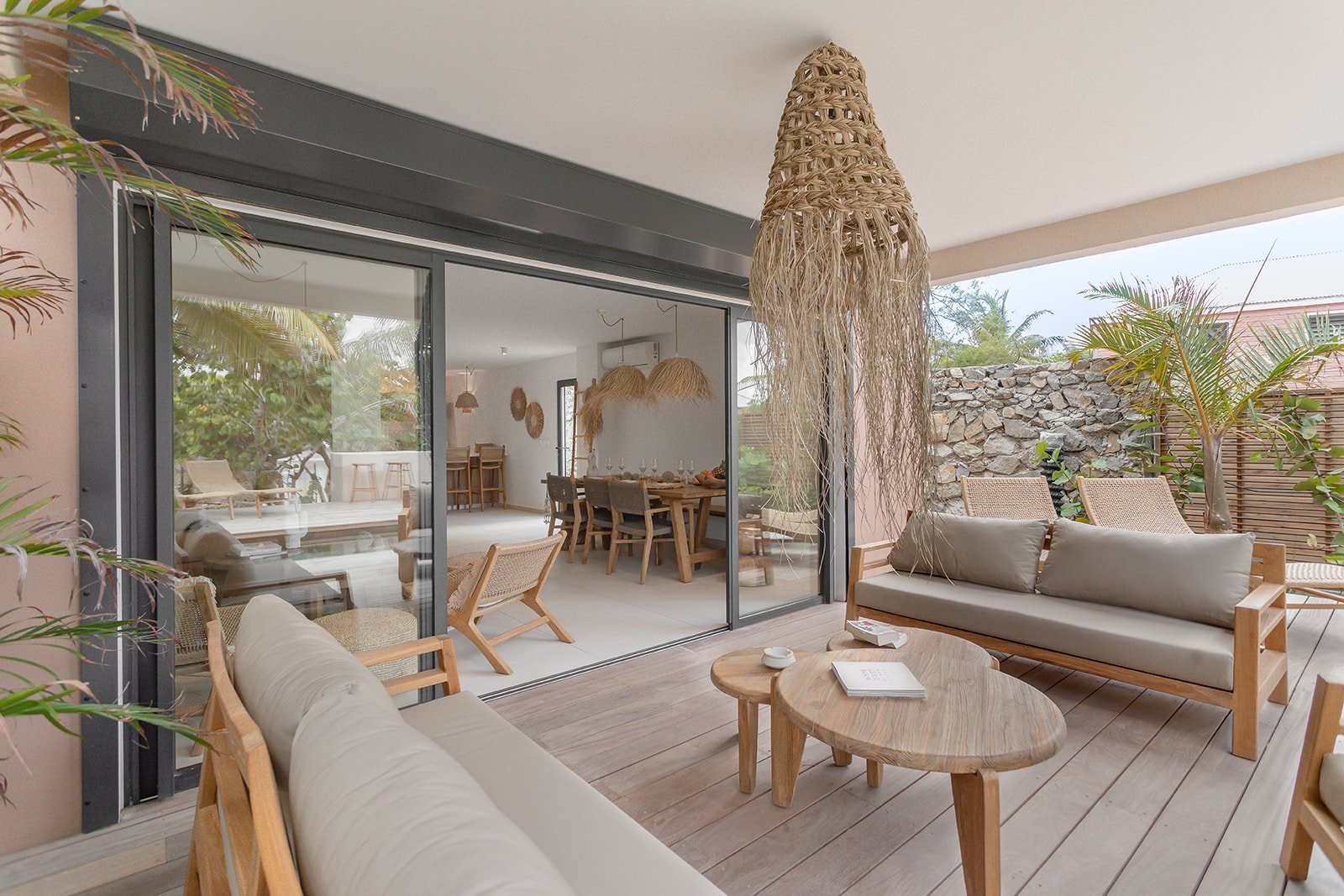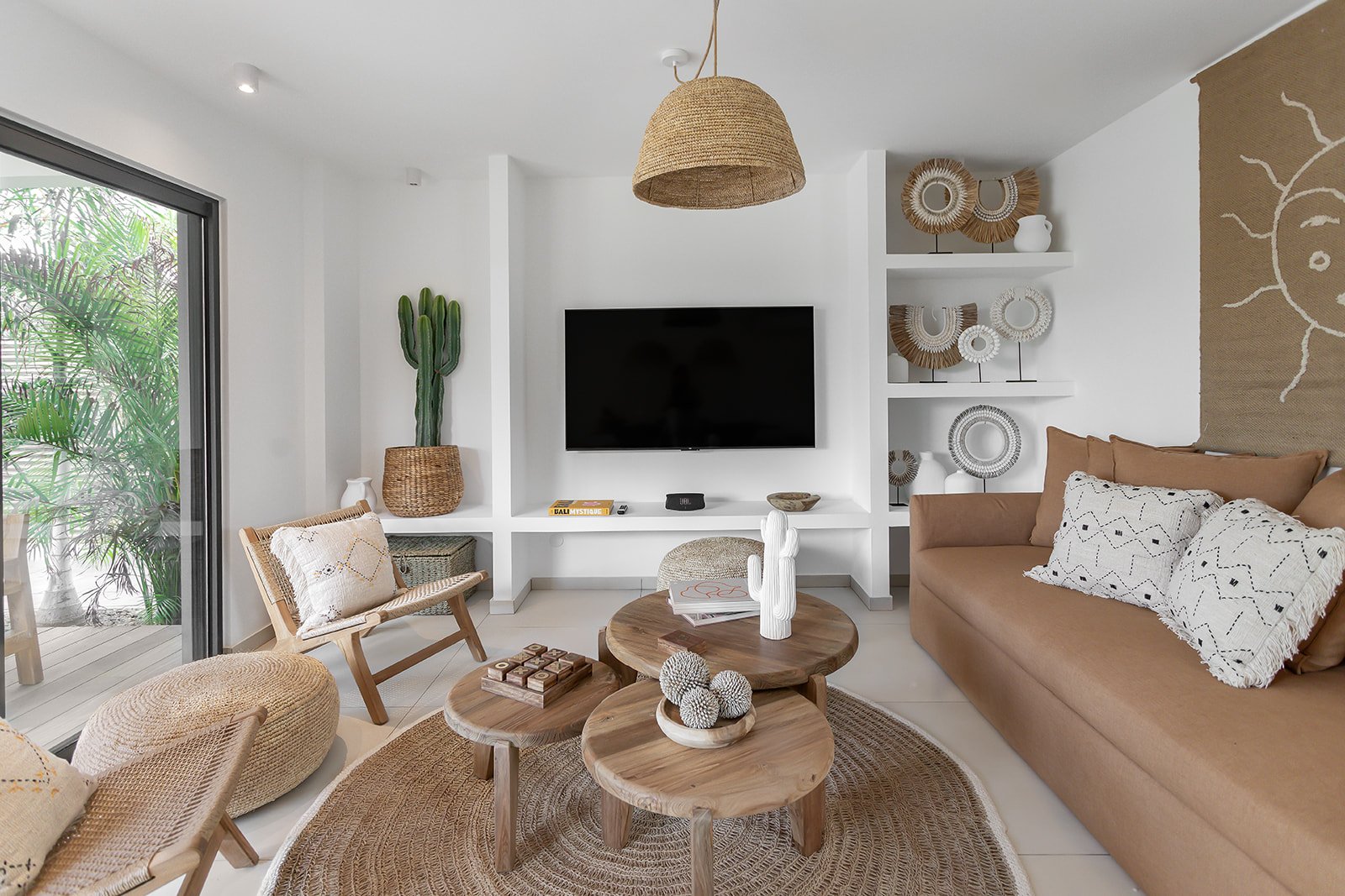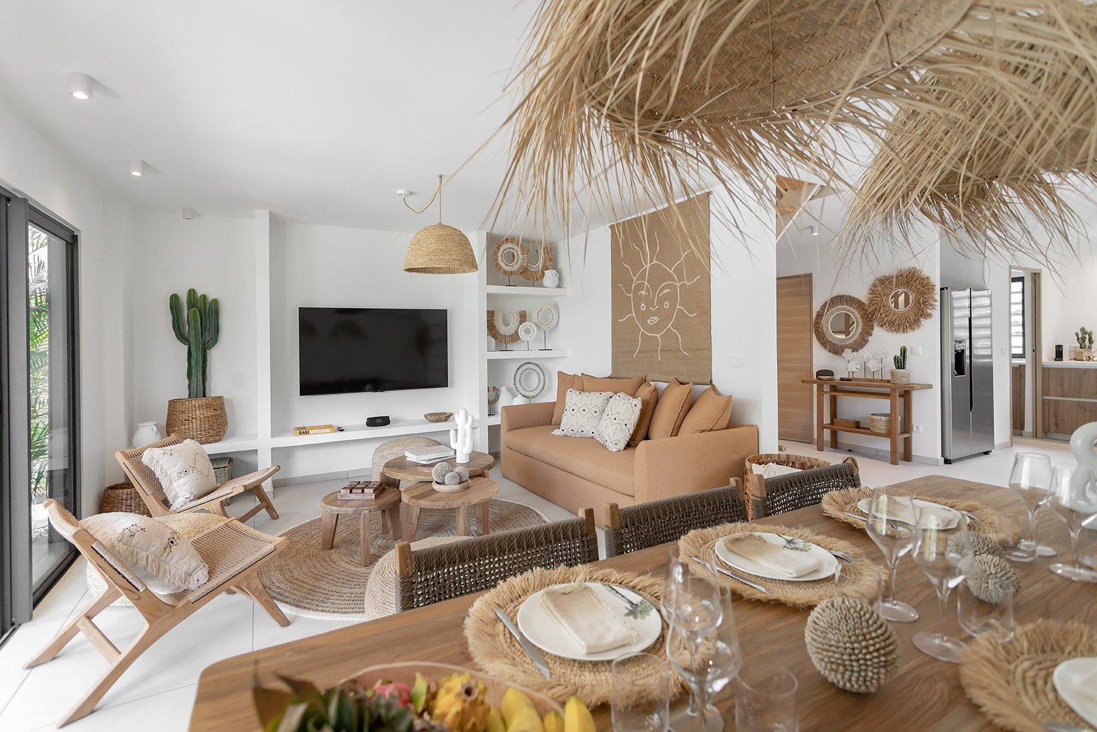 La Villa Coco propose une vaste pièce à vivre baignée de lumière naturelle, où élégance et convivialité se conjuguent à la perfection. Meublé avec goût dans un style à la fois chaleureux et insulaire, il s’ouvre entièrement sur l’extérieur. Disposé de manière à offrir une circulation naturelle vers la cuisine ouverte et la salle à manger, renforçant l’esprit de partage et de détente. Pensé pour le confort et les instants de loisirs, le salon met à disposition une grande télévision, une belle sélection de livres et des jeux de société pour petits et grands. Un véritable cocon pour se retrouver en famille ou entre amis.