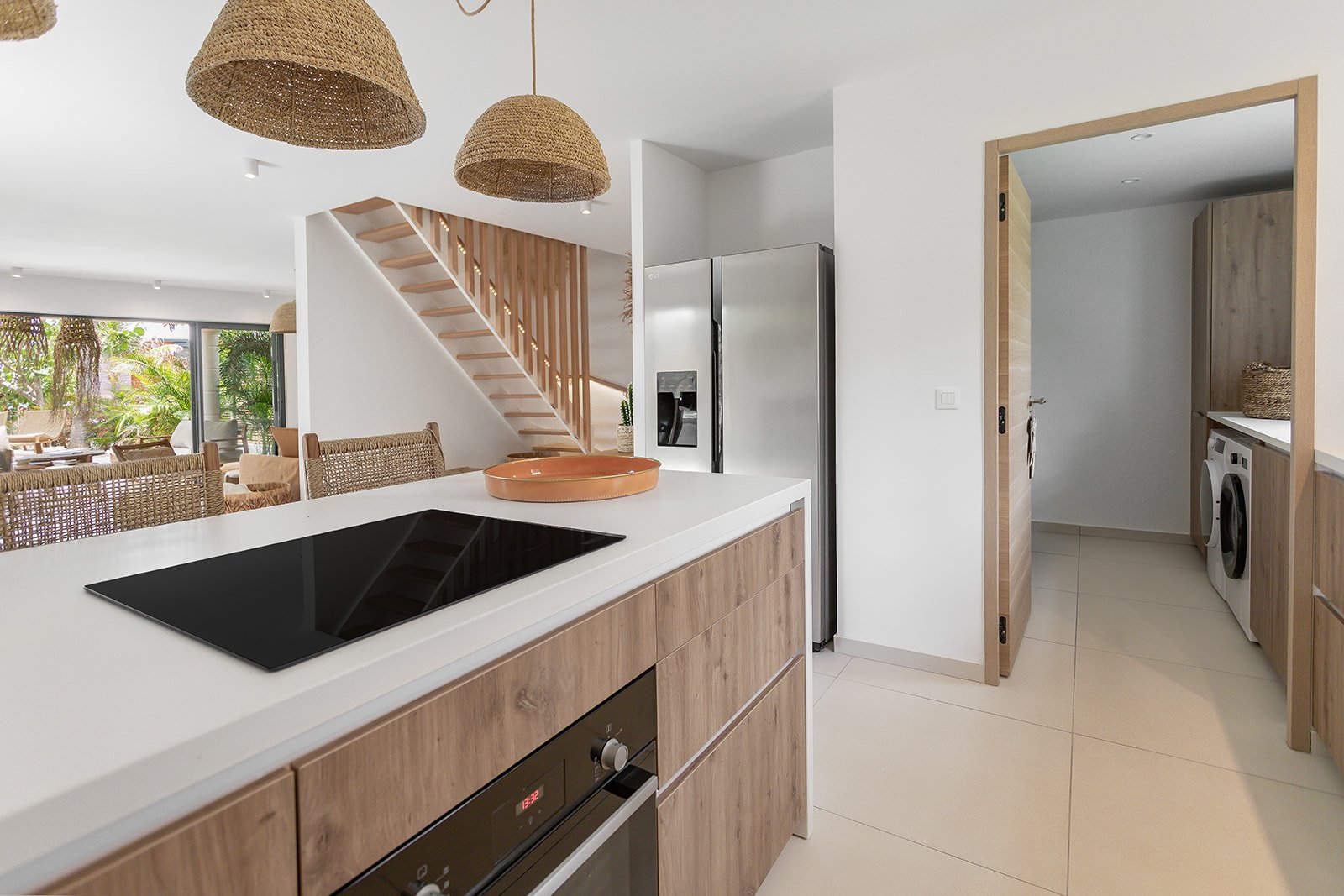 La cuisine ouverte allie fonctionnalité et esthétique avec un équilibre parfait. Conçue dans des matériaux nobles et durables, elle séduit par ses lignes épurées et son élégance discrète. Entièrement équipée et généreusement dotée de rangements, elle répond à tous les besoins, du petit-déjeuner en famille aux dîners plus élaborés. Un îlot invite à la convivialité : on s’y retrouve pour cuisiner, discuter, partager un café ou simplement profiter de l’instant. Ouverte sur le salon et la salle à manger, cette cuisine est le cœur battant de la maison, un espace vivant et accueillant, pensé pour le plaisir de se retrouver.