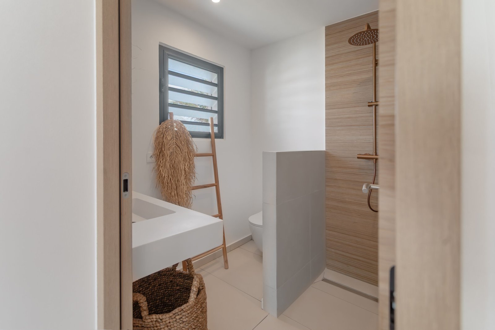 Chaque chambre offre sa propre salle de bain privée, un véritable cocon pensé pour le confort de tous. Chacune est équipée d’une douche, d’un WC et d’un lavabo, et décorée avec soin dans un esprit insulaire et chaleureux. Vous y trouverez tout le confort nécessaire pour vous détendre et vous ressourcer, comme à la maison, mais en vacances.