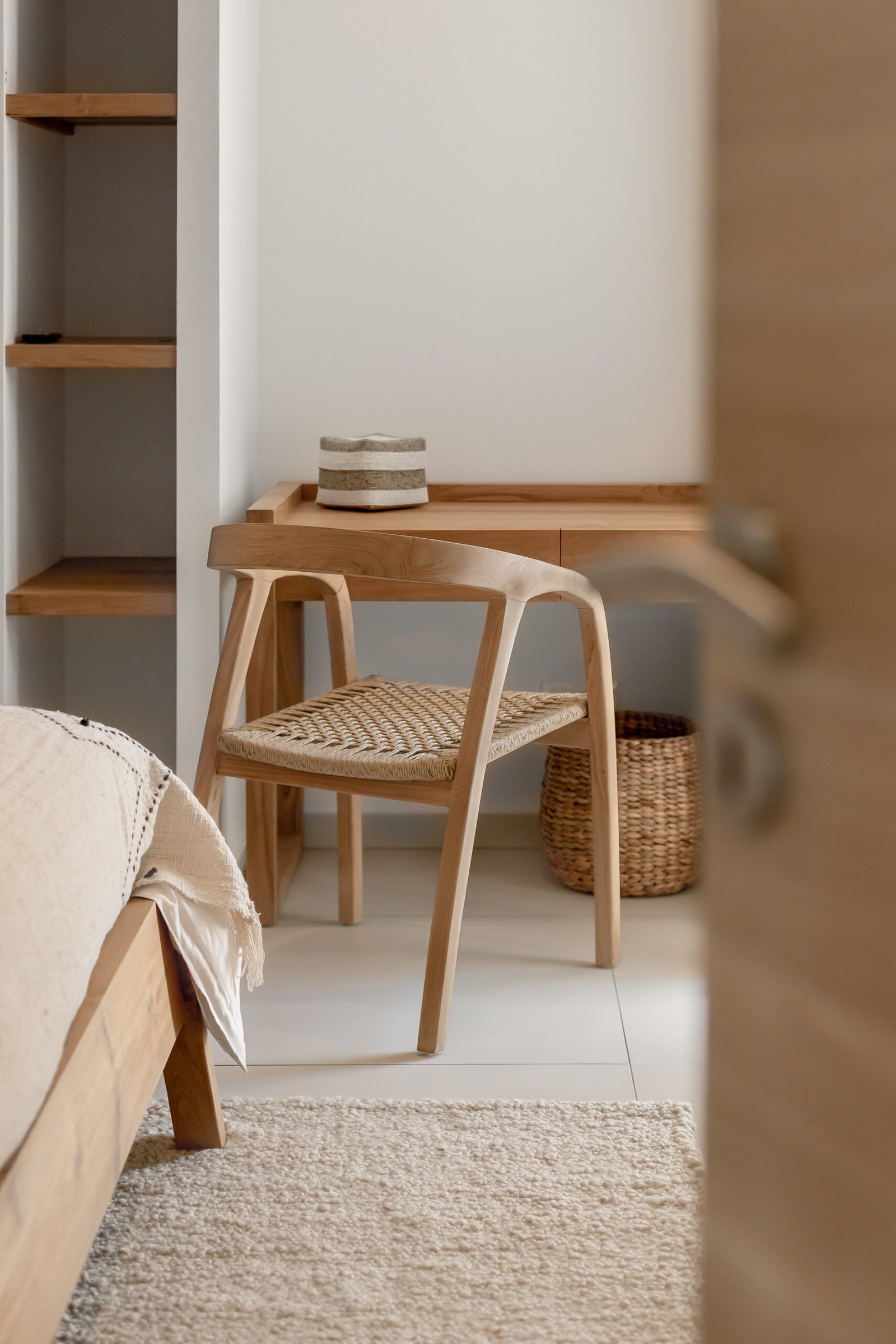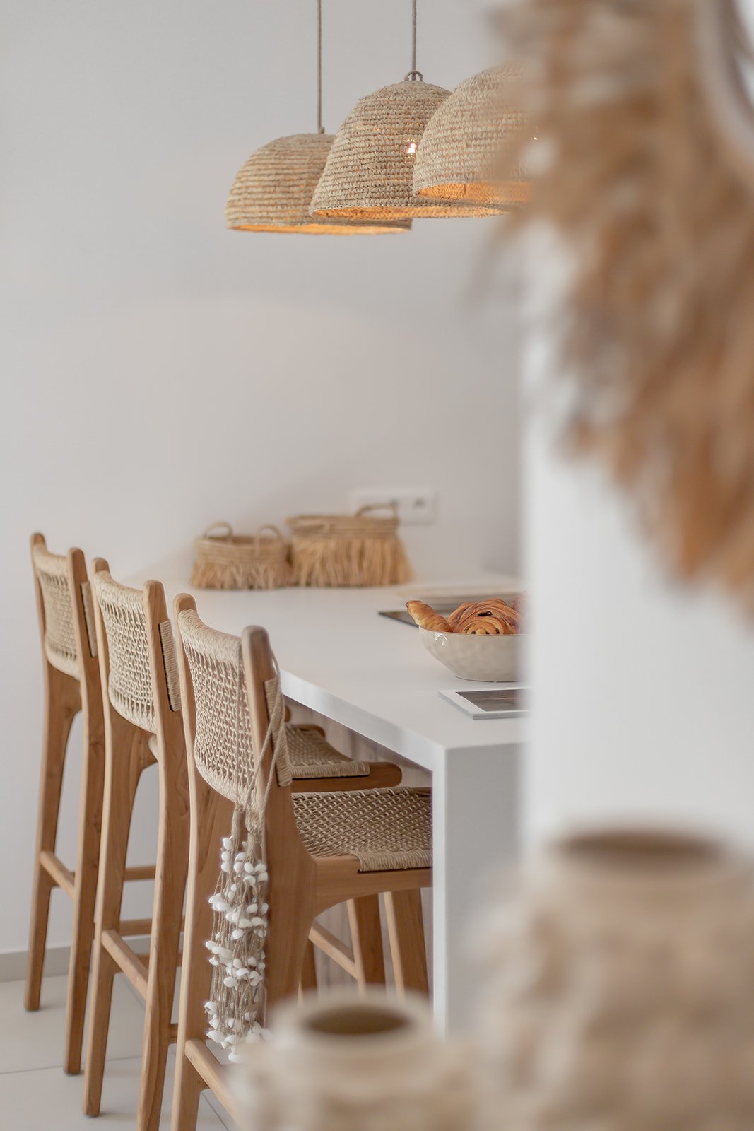 La Villa Kaia propose une grande table, pouvant accueillir confortablement jusqu’à huit convives, idĂ©ale pour partager un dĂ©jeuner au frais, tout en profitant du calme d’un Ă©crin de verdure. Ouverte sur l’extĂ©rieur et harmonieusement intĂ©grĂ©e Ă  l’espace de vie, elle devient le théâtre des repas en famille ou entre amis, dans une atmosphère dĂ©tendue et lumineuse, bercĂ©e par les embruns et la douceur du climat.