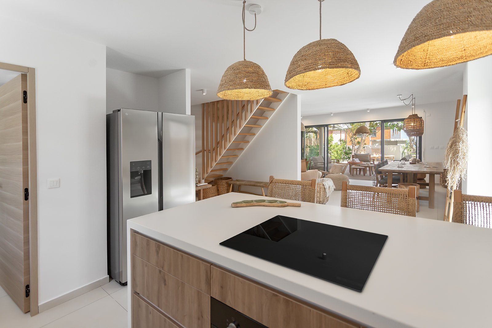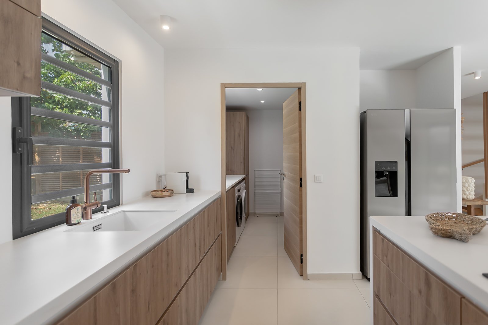 La cuisine ouverte allie fonctionnalité et esthétique avec un équilibre parfait. Conçue dans des matériaux nobles et durables, elle séduit par ses lignes épurées et son élégance discrète. Entièrement équipée et généreusement dotée de rangements, elle répond à tous les besoins, du petit-déjeuner en famille aux dîners plus élaborés. Un îlot invite à la convivialité : on s’y retrouve pour cuisiner, discuter, partager un café ou simplement profiter de l’instant. Ouverte sur le salon et la salle à manger, cette cuisine est le cœur battant de la maison, un espace vivant et accueillant, pensé pour le plaisir de se retrouver.