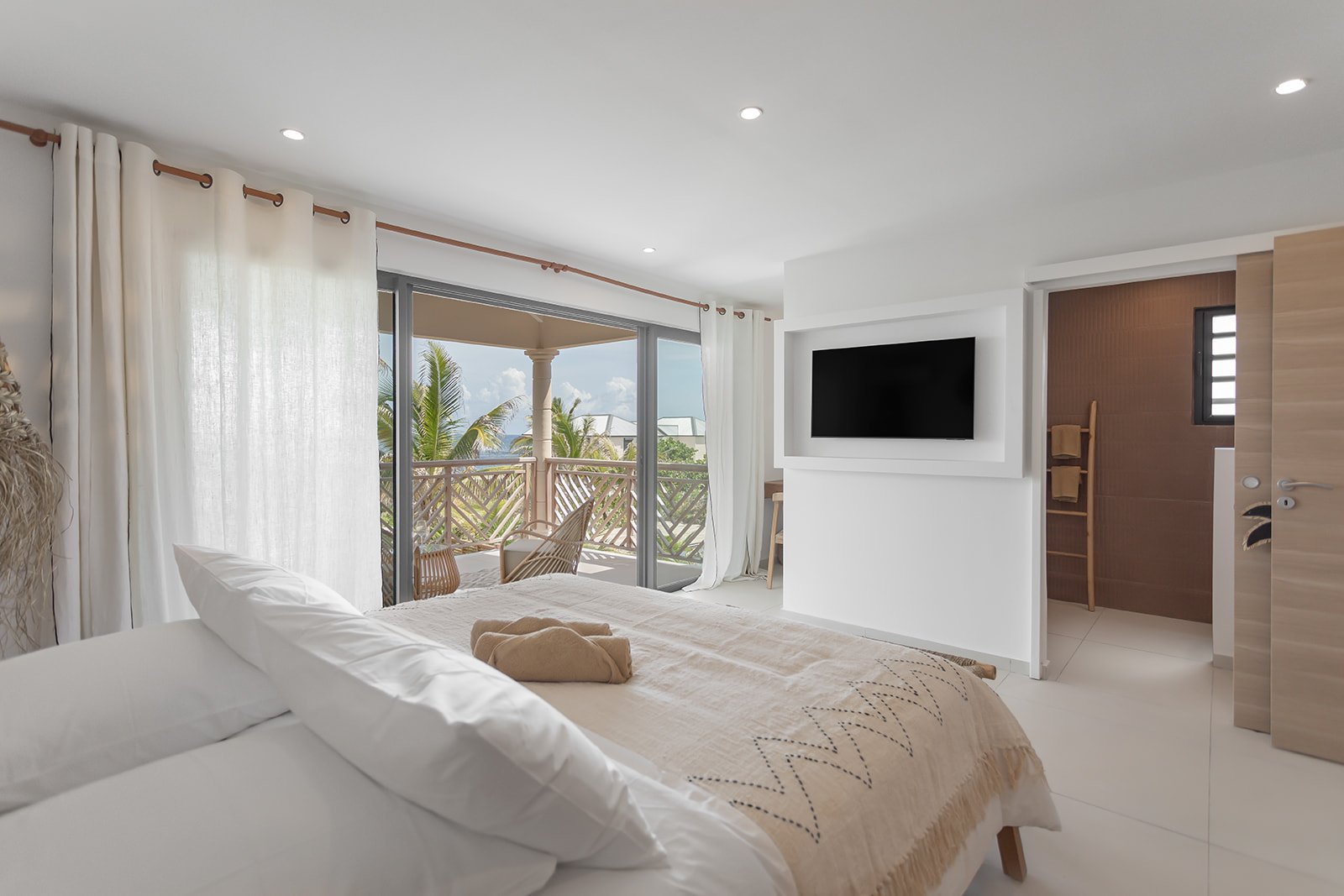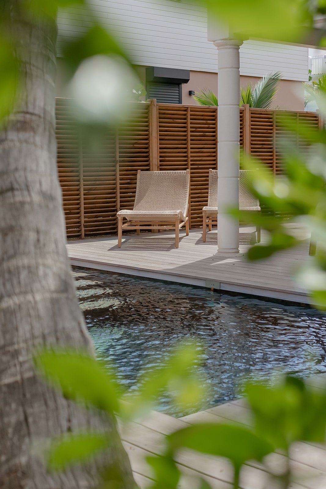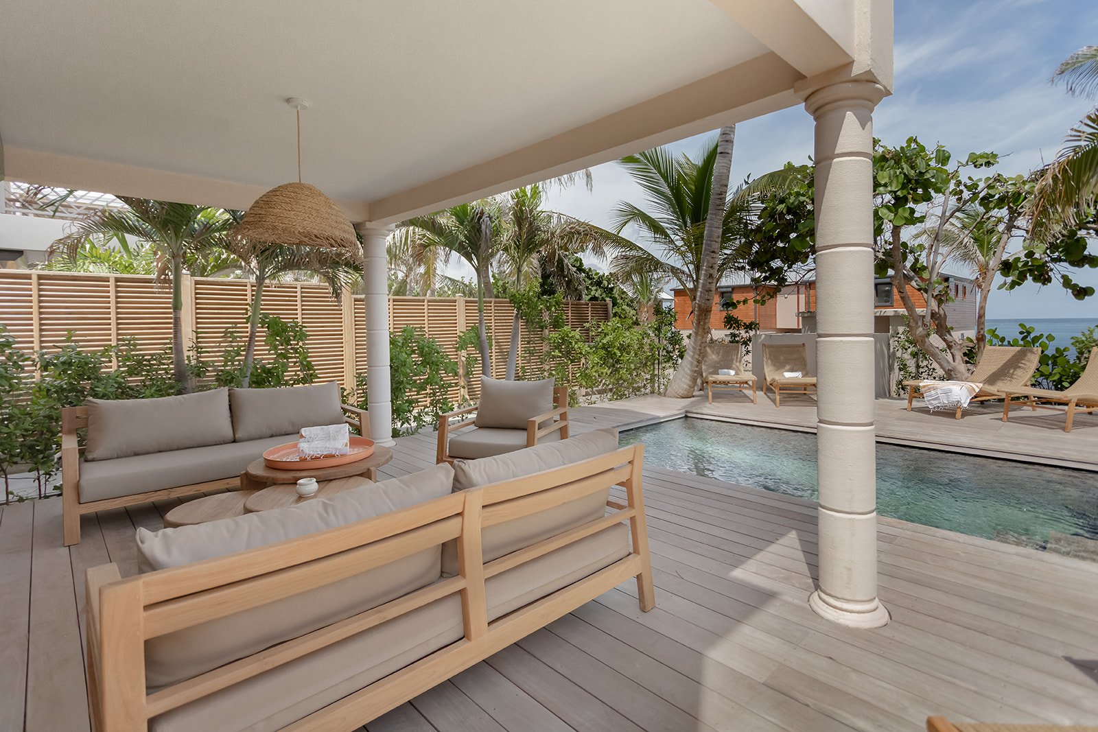 Les extérieurs de la Villa Kaia sont une véritable invitation à la douceur de vivre. Nichée dans un écrin de verdure, encadrée par deux magnifiques cocotiers, la maison bénéficie d’une partielle sur la mer, offrant un spectacle apaisant à chaque instant de la journée. La végétation environnante, luxuriante et soigneusement entretenue, apporte une belle sensation de fraîcheur et d’intimité. Au cœur du jardin, une piscine privative scintille sous le soleil, idéale pour se rafraîchir ou simplement se détendre. Un salon extérieur ombragé et un bar complètent ce cadre idyllique, parfait pour lire, partager un apéritif ou profiter d’un moment de calme en fin de journée. Un véritable havre de paix entre ciel, mer et nature.