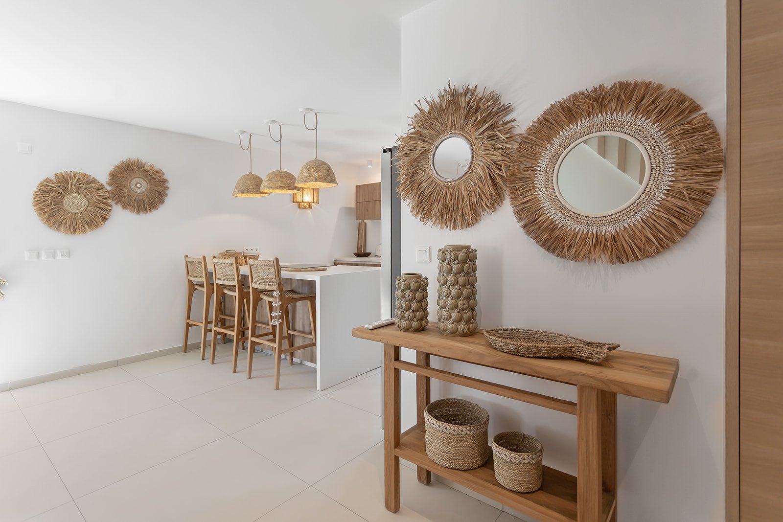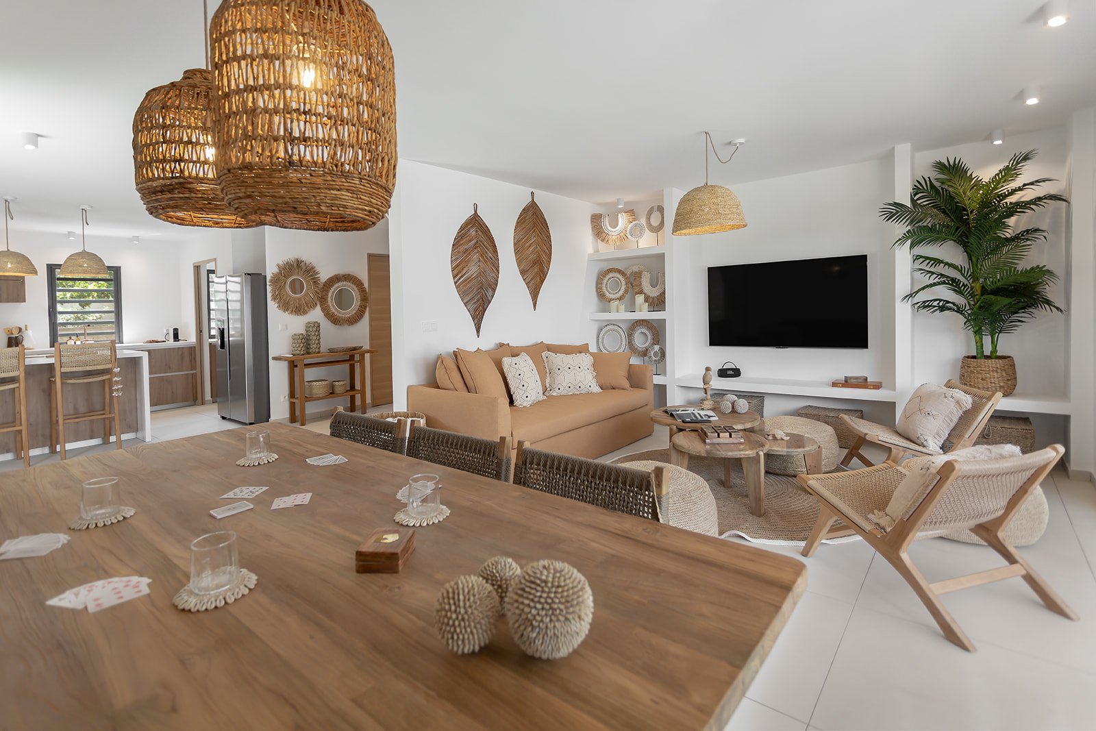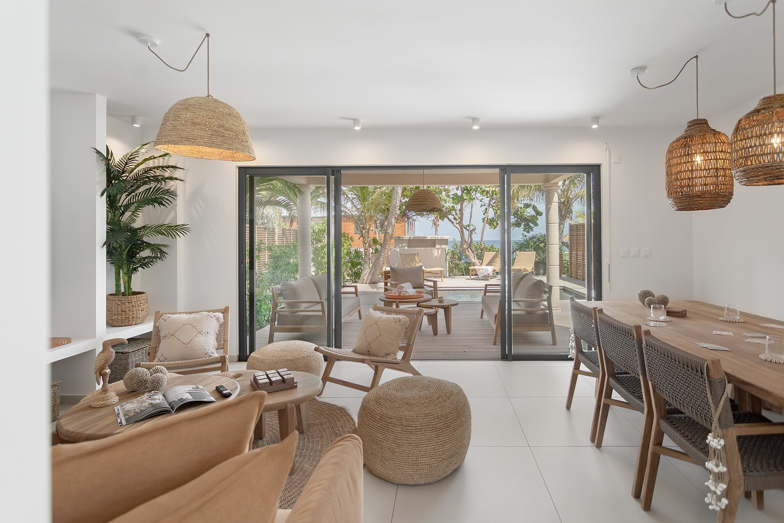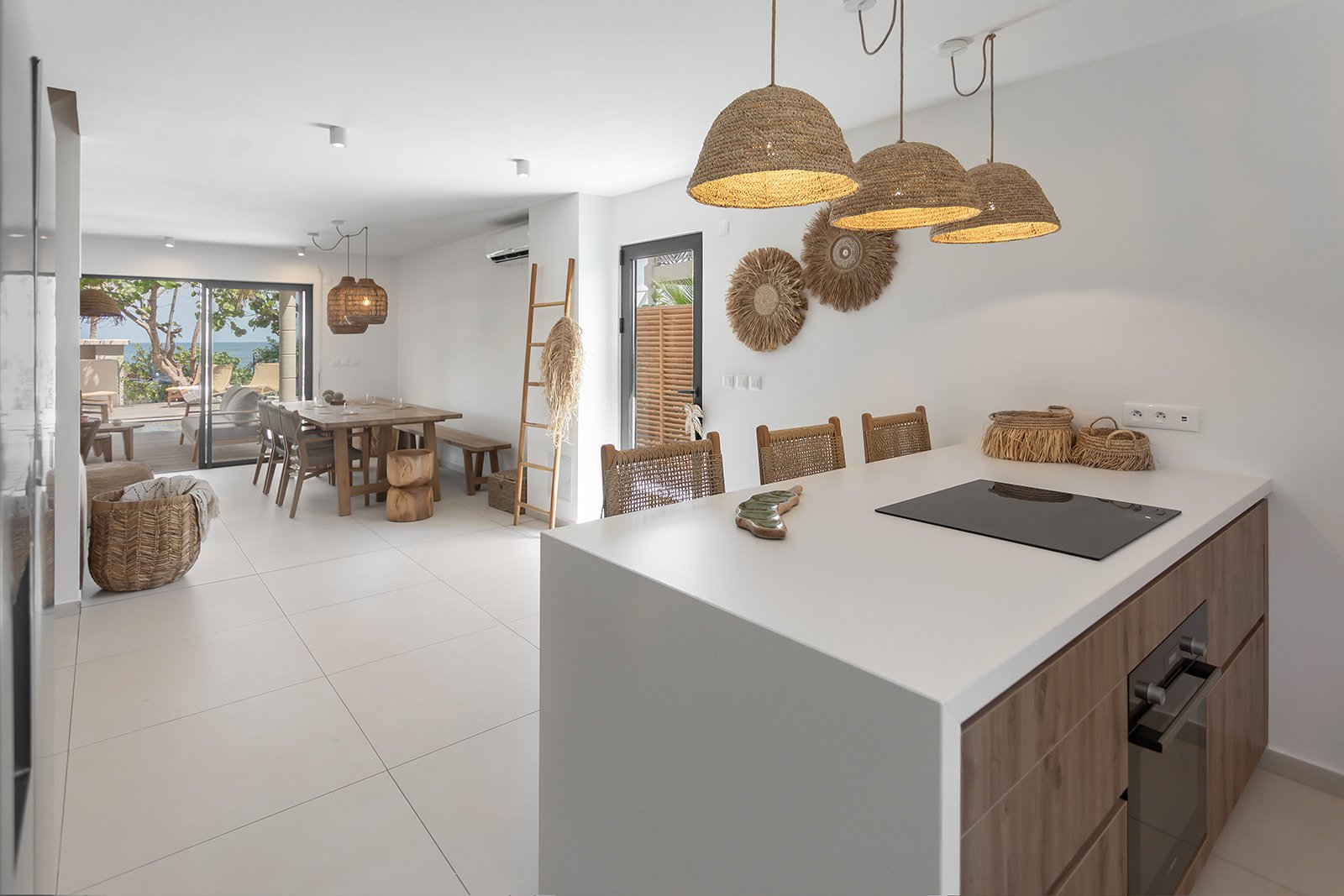 La Villa Kaia propose une vaste pièce à vivre baignée de lumière naturelle, où élégance et convivialité se conjuguent à la perfection. Meublé avec goût dans un style à la fois chaleureux et insulaire, il s’ouvre entièrement sur l’extérieur. Disposé de manière à offrir une circulation naturelle vers la cuisine ouverte et la salle à manger, renforçant l’esprit de partage et de détente. Pensé pour le confort et les instants de loisirs, le salon met à disposition une grande télévision, une belle sélection de livres et des jeux de société pour petits et grands. Un véritable cocon pour se retrouver en famille ou entre amis.